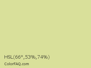 HSL 66°,53%,74% Color is a light yellow color and the nearest color is Deco #d2da97. Hex code #d9e09a and RGB value is rgb(217,224,154). In RGB color space, this color is composed of 85% red, 88% green, 60% blue, In CMYK color space, this color is composed of 3% cyan, 0% magenta, 31% yellow , 12% black , In HSL color space, this color has a hue angle of 66° , 53% saturation and 74% lightness.
