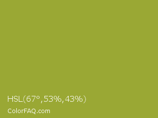 HSL 67°,53%,43% Color is a normal yellow color and the nearest color is Sushi #87ab39. Hex code #9aa834 and RGB value is rgb(154,168,52). In RGB color space, this color is composed of 60% red, 66% green, 20% blue, In CMYK color space, this color is composed of 8% cyan, 0% magenta, 69% yellow , 34% black , In HSL color space, this color has a hue angle of 67° , 53% saturation and 43% lightness.