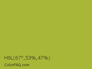 HSL 67°,53%,47% Color is a normal yellow color and the nearest color is Android Green #a4c639. Hex code #a9b738 and RGB value is rgb(169,183,56). In RGB color space, this color is composed of 66% red, 72% green, 22% blue, In CMYK color space, this color is composed of 8% cyan, 0% magenta, 69% yellow , 28% black , In HSL color space, this color has a hue angle of 67° , 53% saturation and 47% lightness.