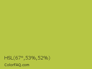 HSL 67°,53%,52% Color is a normal yellow color and the nearest color is Android Green #a4c639. Hex code #b6c644 and RGB value is rgb(182,198,68). In RGB color space, this color is composed of 71% red, 78% green, 27% blue, In CMYK color space, this color is composed of 8% cyan, 0% magenta, 66% yellow , 22% black , In HSL color space, this color has a hue angle of 67° , 53% saturation and 52% lightness.