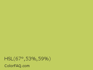 HSL 67°,53%,59% Color is a normal yellow color and the nearest color is June Bud #bdda57. Hex code #c1ce5f and RGB value is rgb(193,206,95). In RGB color space, this color is composed of 76% red, 81% green, 37% blue, In CMYK color space, this color is composed of 6% cyan, 0% magenta, 54% yellow , 19% black , In HSL color space, this color has a hue angle of 67° , 53% saturation and 59% lightness.