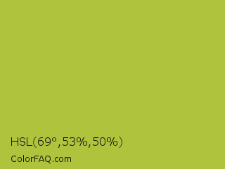 HSL 69°,53%,50% Color is a normal yellow color and the nearest color is Android Green #a4c639. Hex code #afc33c and RGB value is rgb(175,195,60). In RGB color space, this color is composed of 69% red, 76% green, 24% blue, In CMYK color space, this color is composed of 10% cyan, 0% magenta, 69% yellow , 24% black , In HSL color space, this color has a hue angle of 69° , 53% saturation and 50% lightness.