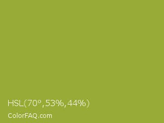 HSL 70°,53%,44% Color is a normal yellow color and the nearest color is Sushi #87ab39. Hex code #98ac35 and RGB value is rgb(152,172,53). In RGB color space, this color is composed of 60% red, 67% green, 21% blue, In CMYK color space, this color is composed of 12% cyan, 0% magenta, 69% yellow , 33% black , In HSL color space, this color has a hue angle of 70° , 53% saturation and 44% lightness.