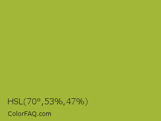 HSL 70°,53%,47% Color is a normal yellow color and the nearest color is Android Green #a4c639. Hex code #a2b738 and RGB value is rgb(162,183,56). In RGB color space, this color is composed of 64% red, 72% green, 22% blue, In CMYK color space, this color is composed of 11% cyan, 0% magenta, 69% yellow , 28% black , In HSL color space, this color has a hue angle of 70° , 53% saturation and 47% lightness.