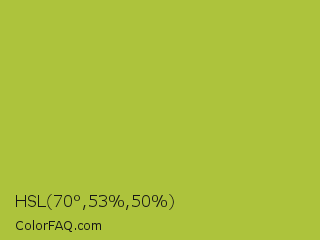 HSL 70°,53%,50% Color is a normal yellow color and the nearest color is Android Green #a4c639. Hex code #adc33c and RGB value is rgb(173,195,60). In RGB color space, this color is composed of 68% red, 76% green, 24% blue, In CMYK color space, this color is composed of 11% cyan, 0% magenta, 69% yellow , 24% black , In HSL color space, this color has a hue angle of 70° , 53% saturation and 50% lightness.