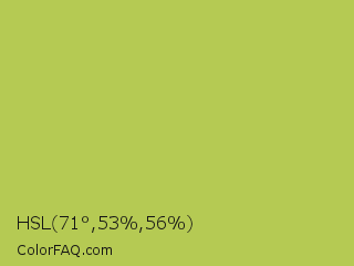 HSL 71°,53%,56% Color is a normal lime color and the nearest color is Celery #b8c25d. Hex code #b5ca53 and RGB value is rgb(181,202,83). In RGB color space, this color is composed of 71% red, 79% green, 33% blue, In CMYK color space, this color is composed of 10% cyan, 0% magenta, 59% yellow , 21% black , In HSL color space, this color has a hue angle of 71° , 53% saturation and 56% lightness.