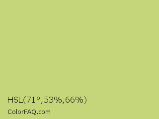 HSL 71°,53%,66% Color is a light lime color and the nearest color is Yellow Green #c5e17a. Hex code #c5d67a and RGB value is rgb(197,214,122). In RGB color space, this color is composed of 77% red, 84% green, 48% blue, In CMYK color space, this color is composed of 8% cyan, 0% magenta, 43% yellow , 16% black , In HSL color space, this color has a hue angle of 71° , 53% saturation and 66% lightness.