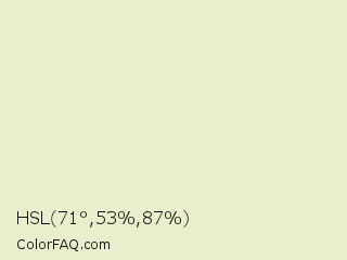 HSL 71°,53%,87% Color is a very light lime color and the nearest color is Aths Special #ecebce. Hex code #e9efcc and RGB value is rgb(233,239,204). In RGB color space, this color is composed of 91% red, 94% green, 80% blue, In CMYK color space, this color is composed of 3% cyan, 0% magenta, 15% yellow , 6% black , In HSL color space, this color has a hue angle of 71° , 53% saturation and 87% lightness.