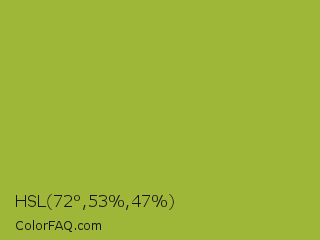HSL 72°,53%,47% Color is a normal lime color and the nearest color is Android Green #a4c639. Hex code #9eb738 and RGB value is rgb(158,183,56). In RGB color space, this color is composed of 62% red, 72% green, 22% blue, In CMYK color space, this color is composed of 14% cyan, 0% magenta, 69% yellow , 28% black , In HSL color space, this color has a hue angle of 72° , 53% saturation and 47% lightness.