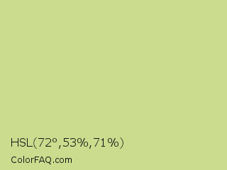 HSL 72°,53%,71% Color is a light lime color and the nearest color is Medium Spring Bud #c9dc87. Hex code #ccdc8e and RGB value is rgb(204,220,142). In RGB color space, this color is composed of 80% red, 86% green, 56% blue, In CMYK color space, this color is composed of 7% cyan, 0% magenta, 35% yellow , 14% black , In HSL color space, this color has a hue angle of 72° , 53% saturation and 71% lightness.