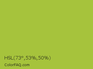 HSL 73°,53%,50% Color is a normal lime color and the nearest color is Android Green #a4c639. Hex code #a6c33c and RGB value is rgb(166,195,60). In RGB color space, this color is composed of 65% red, 76% green, 24% blue, In CMYK color space, this color is composed of 15% cyan, 0% magenta, 69% yellow , 24% black , In HSL color space, this color has a hue angle of 73° , 53% saturation and 50% lightness.