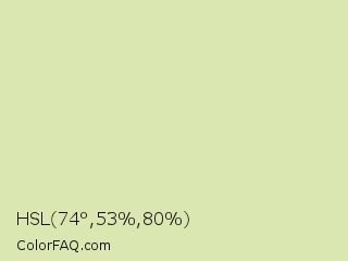 HSL 74°,53%,80% Color is a light lime color and the nearest color is Caper #dcedb4. Hex code #dae7b1 and RGB value is rgb(218,231,177). In RGB color space, this color is composed of 85% red, 91% green, 69% blue, In CMYK color space, this color is composed of 6% cyan, 0% magenta, 23% yellow , 9% black , In HSL color space, this color has a hue angle of 74° , 53% saturation and 80% lightness.