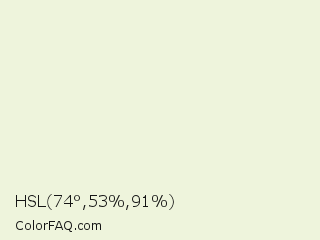 HSL 74°,53%,91% Color is a very light lime color and the nearest color is Frost #edf5dd. Hex code #eef4dc and RGB value is rgb(238,244,220). In RGB color space, this color is composed of 93% red, 96% green, 86% blue, In CMYK color space, this color is composed of 2% cyan, 0% magenta, 10% yellow , 4% black , In HSL color space, this color has a hue angle of 74° , 53% saturation and 91% lightness.