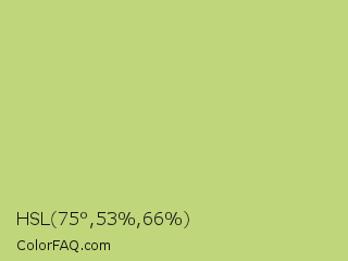 HSL 75°,53%,66% Color is a light lime color and the nearest color is Yellow Green #c5e17a. Hex code #bfd67a and RGB value is rgb(191,214,122). In RGB color space, this color is composed of 75% red, 84% green, 48% blue, In CMYK color space, this color is composed of 11% cyan, 0% magenta, 43% yellow , 16% black , In HSL color space, this color has a hue angle of 75° , 53% saturation and 66% lightness.