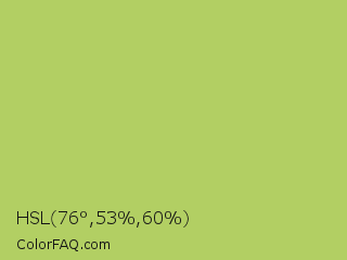HSL 76°,53%,60% Color is a normal lime color and the nearest color is Wild Willow #b9c46a. Hex code #b2cf63 and RGB value is rgb(178,207,99). In RGB color space, this color is composed of 70% red, 81% green, 39% blue, In CMYK color space, this color is composed of 14% cyan, 0% magenta, 52% yellow , 19% black , In HSL color space, this color has a hue angle of 76° , 53% saturation and 60% lightness.