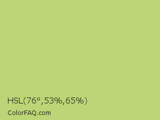 HSL 76°,53%,65% Color is a light lime color and the nearest color is Yellow Green #c5e17a. Hex code #bcd576 and RGB value is rgb(188,213,118). In RGB color space, this color is composed of 74% red, 84% green, 46% blue, In CMYK color space, this color is composed of 12% cyan, 0% magenta, 45% yellow , 16% black , In HSL color space, this color has a hue angle of 76° , 53% saturation and 65% lightness.