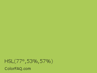 HSL 77°,53%,57% Color is a normal lime color and the nearest color is Middle Green Yellow #acbf60. Hex code #abcb57 and RGB value is rgb(171,203,87). In RGB color space, this color is composed of 67% red, 80% green, 34% blue, In CMYK color space, this color is composed of 16% cyan, 0% magenta, 57% yellow , 20% black , In HSL color space, this color has a hue angle of 77° , 53% saturation and 57% lightness.