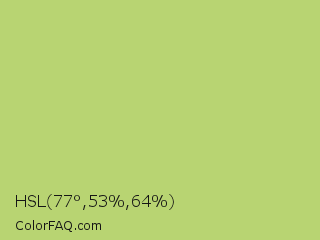 HSL 77°,53%,64% Color is a light lime color and the nearest color is Wild Willow #b9c46a. Hex code #b8d472 and RGB value is rgb(184,212,114). In RGB color space, this color is composed of 72% red, 83% green, 45% blue, In CMYK color space, this color is composed of 13% cyan, 0% magenta, 46% yellow , 17% black , In HSL color space, this color has a hue angle of 77° , 53% saturation and 64% lightness.