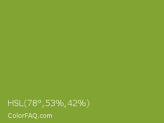HSL 78°,53%,42% Color is a normal lime color and the nearest color is Sushi #87ab39. Hex code #82a432 and RGB value is rgb(130,164,50). In RGB color space, this color is composed of 51% red, 64% green, 20% blue, In CMYK color space, this color is composed of 21% cyan, 0% magenta, 70% yellow , 36% black , In HSL color space, this color has a hue angle of 78° , 53% saturation and 42% lightness.