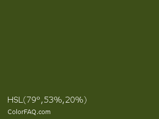 HSL 79°,53%,20% Color is a very dark lime color and the nearest color is Clover #384910. Hex code #3d4e18 and RGB value is rgb(61,78,24). In RGB color space, this color is composed of 24% red, 31% green, 9% blue, In CMYK color space, this color is composed of 22% cyan, 0% magenta, 69% yellow , 69% black , In HSL color space, this color has a hue angle of 79° , 53% saturation and 20% lightness.