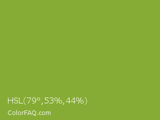 HSL 79°,53%,44% Color is a normal lime color and the nearest color is Sushi #87ab39. Hex code #86ac35 and RGB value is rgb(134,172,53). In RGB color space, this color is composed of 53% red, 67% green, 21% blue, In CMYK color space, this color is composed of 22% cyan, 0% magenta, 69% yellow , 33% black , In HSL color space, this color has a hue angle of 79° , 53% saturation and 44% lightness.