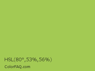 HSL 80°,53%,56% Color is a normal green color and the nearest color is Middle Green Yellow #acbf60. Hex code #a3ca53 and RGB value is rgb(163,202,83). In RGB color space, this color is composed of 64% red, 79% green, 33% blue, In CMYK color space, this color is composed of 19% cyan, 0% magenta, 59% yellow , 21% black , In HSL color space, this color has a hue angle of 80° , 53% saturation and 56% lightness.
