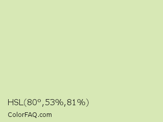 HSL 80°,53%,81% Color is a very light green color and the nearest color is Caper #dcedb4. Hex code #d7e8b5 and RGB value is rgb(215,232,181). In RGB color space, this color is composed of 84% red, 91% green, 71% blue, In CMYK color space, this color is composed of 7% cyan, 0% magenta, 22% yellow , 9% black , In HSL color space, this color has a hue angle of 80° , 53% saturation and 81% lightness.