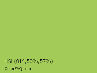 HSL 81°,53%,57% Color is a normal green color and the nearest color is Middle Green Yellow #acbf60. Hex code #a3cb57 and RGB value is rgb(163,203,87). In RGB color space, this color is composed of 64% red, 80% green, 34% blue, In CMYK color space, this color is composed of 20% cyan, 0% magenta, 57% yellow , 20% black , In HSL color space, this color has a hue angle of 81° , 53% saturation and 57% lightness.