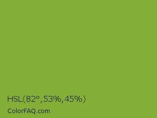 HSL 82°,53%,45% Color is a normal green color and the nearest color is Sushi #87ab39. Hex code #83af36 and RGB value is rgb(131,175,54). In RGB color space, this color is composed of 51% red, 69% green, 21% blue, In CMYK color space, this color is composed of 25% cyan, 0% magenta, 69% yellow , 31% black , In HSL color space, this color has a hue angle of 82° , 53% saturation and 45% lightness.