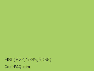 HSL 82°,53%,60% Color is a normal green color and the nearest color is Middle Green Yellow #acbf60. Hex code #a7cf63 and RGB value is rgb(167,207,99). In RGB color space, this color is composed of 65% red, 81% green, 39% blue, In CMYK color space, this color is composed of 19% cyan, 0% magenta, 52% yellow , 19% black , In HSL color space, this color has a hue angle of 82° , 53% saturation and 60% lightness.
