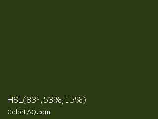 HSL 83°,53%,15% Color is a very dark green color and the nearest color is Turtle Green #2a380b. Hex code #2b3a12 and RGB value is rgb(43,58,18). In RGB color space, this color is composed of 17% red, 23% green, 7% blue, In CMYK color space, this color is composed of 26% cyan, 0% magenta, 69% yellow , 77% black , In HSL color space, this color has a hue angle of 83° , 53% saturation and 15% lightness.