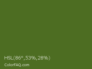 HSL 86°,53%,28% Color is a dark green color and the nearest color is Dark Olive Green #556b2f. Hex code #4d6d22 and RGB value is rgb(77,109,34). In RGB color space, this color is composed of 30% red, 43% green, 13% blue, In CMYK color space, this color is composed of 29% cyan, 0% magenta, 69% yellow , 57% black , In HSL color space, this color has a hue angle of 86° , 53% saturation and 28% lightness.
