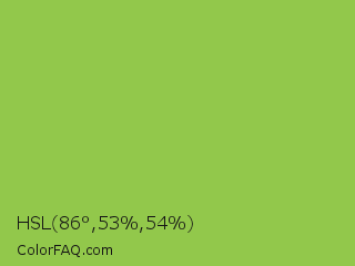 HSL 86°,53%,54% Color is a normal green color and the nearest color is Android Green #a4c639. Hex code #92c84b and RGB value is rgb(146,200,75). In RGB color space, this color is composed of 57% red, 78% green, 29% blue, In CMYK color space, this color is composed of 27% cyan, 0% magenta, 63% yellow , 22% black , In HSL color space, this color has a hue angle of 86° , 53% saturation and 54% lightness.