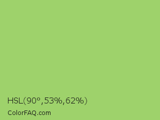 HSL 90°,53%,62% Color is a light green color and the nearest color is Pistachio #93c572. Hex code #9ed26b and RGB value is rgb(158,210,107). In RGB color space, this color is composed of 62% red, 82% green, 42% blue, In CMYK color space, this color is composed of 25% cyan, 0% magenta, 49% yellow , 18% black , In HSL color space, this color has a hue angle of 90° , 53% saturation and 62% lightness.