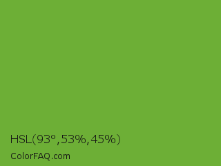 HSL 93°,53%,45% Color is a normal green color and the nearest color is Green RYB #66b032. Hex code #6daf36 and RGB value is rgb(109,175,54). In RGB color space, this color is composed of 43% red, 69% green, 21% blue, In CMYK color space, this color is composed of 38% cyan, 0% magenta, 69% yellow , 31% black , In HSL color space, this color has a hue angle of 93° , 53% saturation and 45% lightness.