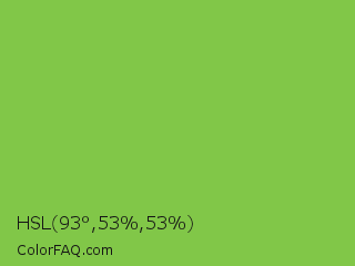 HSL 93°,53%,53% Color is a normal green color and the nearest color is Bud Green #7bb661. Hex code #81c748 and RGB value is rgb(129,199,72). In RGB color space, this color is composed of 51% red, 78% green, 28% blue, In CMYK color space, this color is composed of 35% cyan, 0% magenta, 64% yellow , 22% black , In HSL color space, this color has a hue angle of 93° , 53% saturation and 53% lightness.