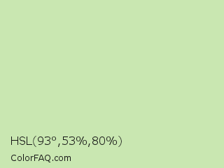 HSL 93°,53%,80% Color is a light green color and the nearest color is Sprout #c1d7b0. Hex code #c9e7b1 and RGB value is rgb(201,231,177). In RGB color space, this color is composed of 79% red, 91% green, 69% blue, In CMYK color space, this color is composed of 13% cyan, 0% magenta, 23% yellow , 9% black , In HSL color space, this color has a hue angle of 93° , 53% saturation and 80% lightness.