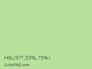 HSL 97°,53%,75% Color is a light green color and the nearest color is Granny Smith Apple #a8e4a0. Hex code #b7e19d and RGB value is rgb(183,225,157). In RGB color space, this color is composed of 72% red, 88% green, 62% blue, In CMYK color space, this color is composed of 19% cyan, 0% magenta, 30% yellow , 12% black , In HSL color space, this color has a hue angle of 97° , 53% saturation and 75% lightness.