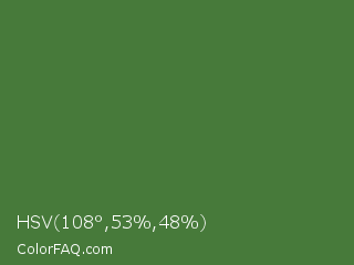 HSV 108°,53%,48% Color is a normal green color and the nearest color is Fern Green #4f7942. Hex code #477a3a and RGB value is rgb(71,122,58). In RGB color space, this color is composed of 28% red, 48% green, 23% blue, In CMYK color space, this color is composed of 42% cyan, 0% magenta, 52% yellow , 52% black , In HSL color space, this color has a hue angle of 108° , 36% saturation and 35% lightness.