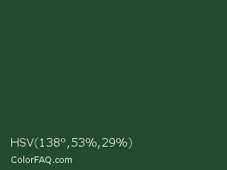 HSV 138°,53%,29% Color is a very dark green color and the nearest color is Cal Poly Pomona Green #1e4d2b. Hex code #234a2f and RGB value is rgb(35,74,47). In RGB color space, this color is composed of 14% red, 29% green, 18% blue, In CMYK color space, this color is composed of 53% cyan, 0% magenta, 36% yellow , 71% black , In HSL color space, this color has a hue angle of 138° , 36% saturation and 21% lightness.