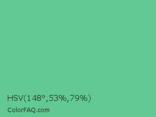 HSV 148°,53%,79% Color is a normal green color and the nearest color is Silver Tree #66b58f. Hex code #5fc991 and RGB value is rgb(95,201,145). In RGB color space, this color is composed of 37% red, 79% green, 57% blue, In CMYK color space, this color is composed of 53% cyan, 0% magenta, 28% yellow , 21% black , In HSL color space, this color has a hue angle of 148° , 50% saturation and 58% lightness.