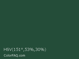 HSV 151°,53%,30% Color is a very dark green color and the nearest color is Brunswick Green #1b4d3e. Hex code #244d39 and RGB value is rgb(36,77,57). In RGB color space, this color is composed of 14% red, 30% green, 22% blue, In CMYK color space, this color is composed of 53% cyan, 0% magenta, 26% yellow , 70% black , In HSL color space, this color has a hue angle of 151° , 36% saturation and 22% lightness.