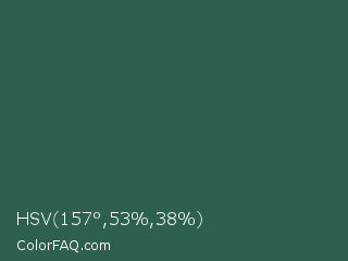 HSV 157°,53%,38% Color is a dark green color and the nearest color is Stromboli #325d52. Hex code #2e614d and RGB value is rgb(46,97,77). In RGB color space, this color is composed of 18% red, 38% green, 30% blue, In CMYK color space, this color is composed of 53% cyan, 0% magenta, 21% yellow , 62% black , In HSL color space, this color has a hue angle of 156° , 36% saturation and 28% lightness.