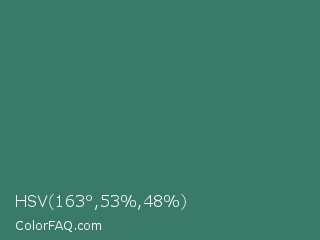 HSV 163°,53%,48% Color is a normal green color and the nearest color is Viridian #40826d. Hex code #3a7a68 and RGB value is rgb(58,122,104). In RGB color space, this color is composed of 23% red, 48% green, 41% blue, In CMYK color space, this color is composed of 52% cyan, 0% magenta, 15% yellow , 52% black , In HSL color space, this color has a hue angle of 163° , 36% saturation and 35% lightness.
