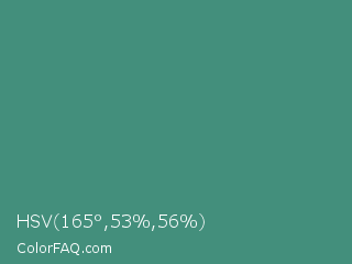 HSV 165°,53%,56% Color is a normal cyan color and the nearest color is Illuminating Emerald #319177. Hex code #438f7c and RGB value is rgb(67,143,124). In RGB color space, this color is composed of 26% red, 56% green, 49% blue, In CMYK color space, this color is composed of 53% cyan, 0% magenta, 13% yellow , 44% black , In HSL color space, this color has a hue angle of 165° , 36% saturation and 41% lightness.
