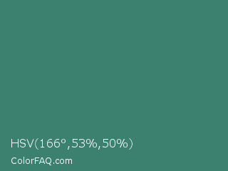 HSV 166°,53%,50% Color is a normal cyan color and the nearest color is Viridian #40826d. Hex code #3c8070 and RGB value is rgb(60,128,112). In RGB color space, this color is composed of 24% red, 50% green, 44% blue, In CMYK color space, this color is composed of 53% cyan, 0% magenta, 13% yellow , 50% black , In HSL color space, this color has a hue angle of 166° , 36% saturation and 37% lightness.