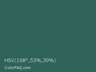 HSV 168°,53%,39% Color is a dark cyan color and the nearest color is Spectra #2f5a57. Hex code #2f6359 and RGB value is rgb(47,99,89). In RGB color space, this color is composed of 18% red, 39% green, 35% blue, In CMYK color space, this color is composed of 53% cyan, 0% magenta, 10% yellow , 61% black , In HSL color space, this color has a hue angle of 168° , 36% saturation and 29% lightness.