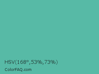 HSV 168°,53%,73% Color is a normal cyan color and the nearest color is Tradewind #5fb3ac. Hex code #57baa6 and RGB value is rgb(87,186,166). In RGB color space, this color is composed of 34% red, 73% green, 65% blue, In CMYK color space, this color is composed of 53% cyan, 0% magenta, 11% yellow , 27% black , In HSL color space, this color has a hue angle of 168° , 42% saturation and 54% lightness.