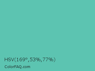HSV 169°,53%,77% Color is a normal cyan color and the nearest color is Tradewind #5fb3ac. Hex code #5cc4b1 and RGB value is rgb(92,196,177). In RGB color space, this color is composed of 36% red, 77% green, 69% blue, In CMYK color space, this color is composed of 53% cyan, 0% magenta, 10% yellow , 23% black , In HSL color space, this color has a hue angle of 169° , 47% saturation and 56% lightness.