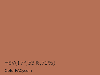 HSV 17°,53%,71% Color is a normal orange color and the nearest color is Santa Fe #b16d52. Hex code #b57055 and RGB value is rgb(181,112,85). In RGB color space, this color is composed of 71% red, 44% green, 33% blue, In CMYK color space, this color is composed of 0% cyan, 38% magenta, 53% yellow , 29% black , In HSL color space, this color has a hue angle of 17° , 39% saturation and 52% lightness.